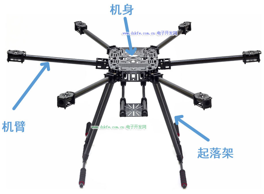 多旋翼飛行器機臂用于連接機身電機,其連接件結構硬度要強,否則會造成機身振動增大飛控姿態解算誤差。起落架的作用是在無人機起飛和降落時起到緩沖的作用。