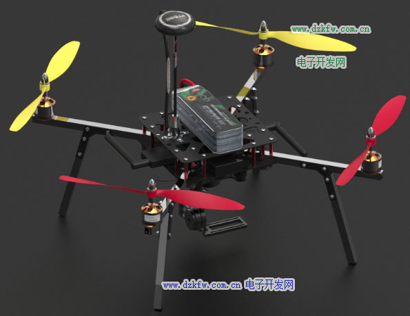 四軸飛行器,也可以同軸共槳,就是一個電機,有上下兩個槳,這樣可以使得飛行器的負載能力提高,但是弊端就是會降低飛行時間。