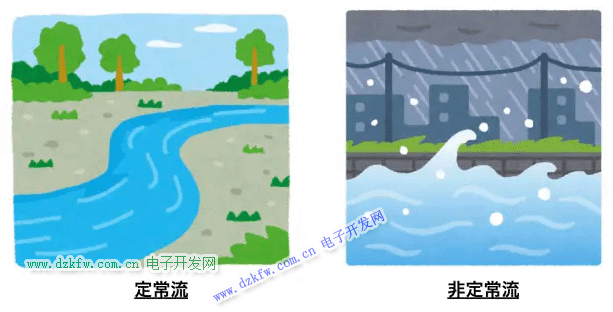狀態不隨時間變化的流稱為穩態流,狀態隨時間變化的流稱為非穩態流。這里的流體狀態指的是速度、壓力、流速和流動方向。例如,在陽光明媚的日子里,微風中的一條河流在條件不變的情況下穩定流動。另一方面,在臺風日,河流流量不穩定,因為流量和流速會根據降水量和風速而變化。