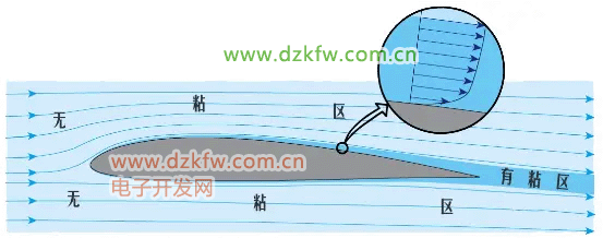 粘性的作用只有發生連續剪切變形才需要考慮粘性剪切力。變形又可以分為:平動、轉動、膨脹、剪切變形。前兩種是剛體作用不會產生內應力,第三種體積均勻改變,流體內部只是正壓力發生變化,只有第四種剪切變形會產生剪切力。 空氣在機翼附近處運動,由于氣體與固體表面存在吸附力,表面那一層氣體分子被粘在機翼上,離開機翼較遠處,氣流則保持較高速度。因此會存在這樣一層,其內部氣流有較大的橫向速度梯度,如圓圈所示,這部分粘性力比較大,稱為有粘區。而較遠處速度梯度很小,粘性力可以忽略不計,這些區域稱為無粘區。