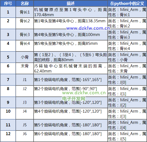 買了一個(gè)六軸機(jī)械臂,作為研究對象,如果是其它機(jī)械臂,可以根據(jù)機(jī)械臂參數(shù)對代碼進(jìn)行修改。機(jī)械臂參數(shù)如下圖所示: