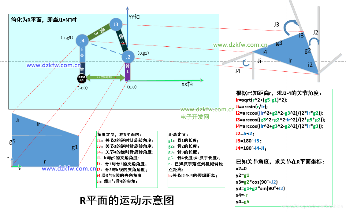總體思路是將機(jī)械臂的三維復(fù)雜運(yùn)動(dòng)簡化為兩個(gè)平面的運(yùn)動(dòng),即“俯視平面”,和“垂直平面(本文叫R平面)”的組合運(yùn)動(dòng)。如下兩個(gè)圖: