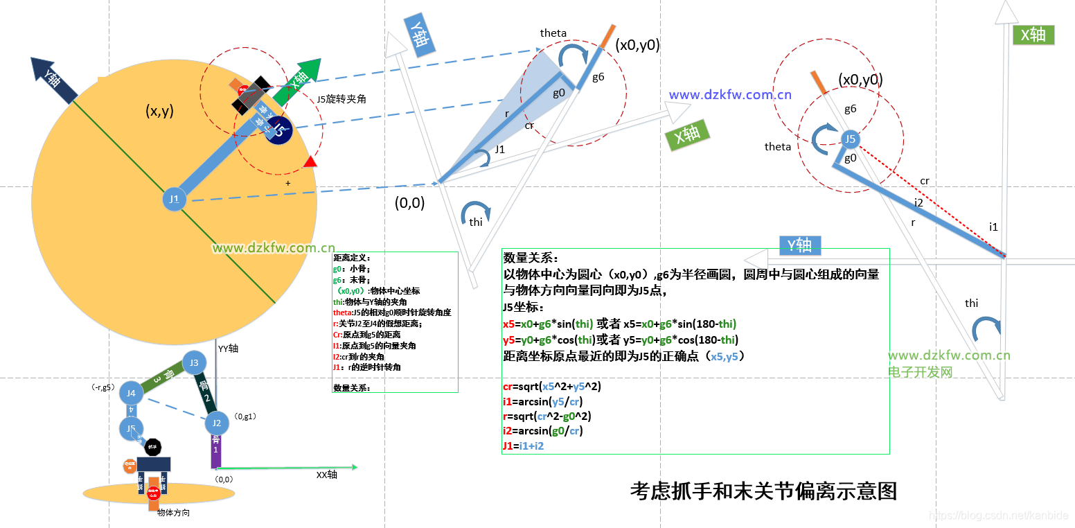普通的機(jī)械臂的控制以上就可以,由于我手頭這個(gè)大象機(jī)械臂比較特殊,有很多90度彎頭,而且抓手安裝后,他的落點(diǎn)與上面簡化模型就出現(xiàn)了偏差,因此,還需要根據(jù)這個(gè)特點(diǎn),根據(jù)實(shí)際的物體坐標(biāo)和主方向,計(jì)算出上節(jié)的理想抓手坐標(biāo)點(diǎn)(x,y),然后就能求出全部關(guān)節(jié)的角度了。