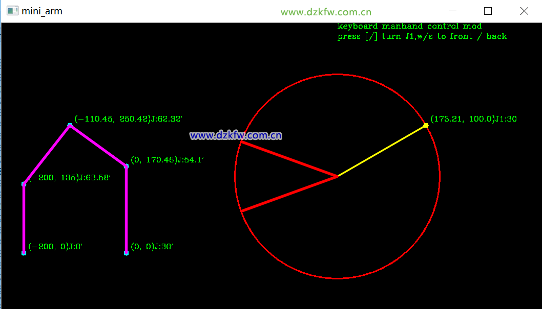 按鍵盤"O"鍵,進(jìn)入自動(dòng)鼠標(biāo)點(diǎn)擊右側(cè)圖機(jī)械臂工作半徑范圍的地方,自動(dòng)計(jì)算各關(guān)節(jié)的旋轉(zhuǎn)坐標(biāo)。
