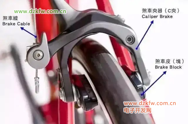 組成部分:剎車夾器(公路車常用的是C型剎車夾器(C夾),亦有使用碟剎),剎車塊,剎車線