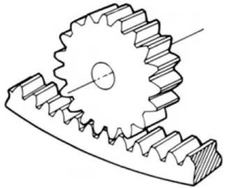 與正齒輪嚙合的直線齒條狀齒輪。可以看成是正齒輪的節(jié)圓直徑變成無限大時的特殊情況。