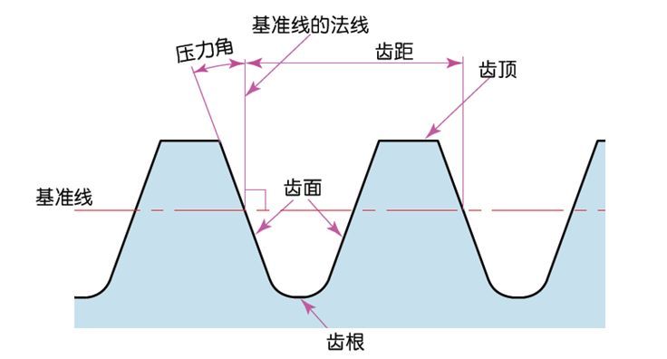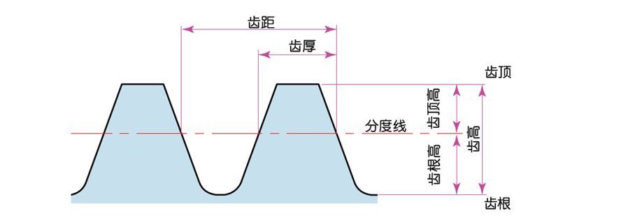模數(shù)乘以圓周率即可得到齒距(p),齒距是相鄰兩齒間的長度。