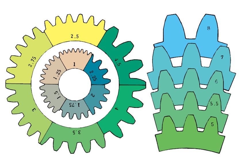另外,在使用英制單位的國家(比如美國),使用符號(徑節(jié))及數(shù)字(分度圓直徑為1英吋時的齒輪的輪齒數(shù))來表示輪齒的大小。比如:DP24、DP8等。還有使用符號(周節(jié))和數(shù)字(毫米)來表示輪齒大小的比較特殊的稱呼方法,比如CP5、CP10。