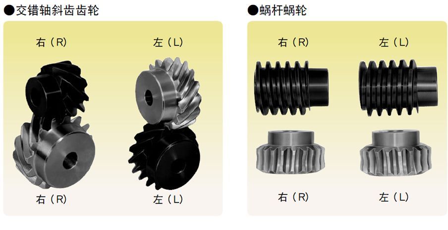 斜齒齒輪、弧齒傘形齒輪等,輪齒呈螺旋狀的齒輪,螺旋方向和配合是一定的。螺旋方向是指當(dāng)齒輪的中心軸指向上下,從正面看上去時,輪齒的方向指向右上的是[右旋],左上的是[左旋]。各種齒輪的配合如下所示。