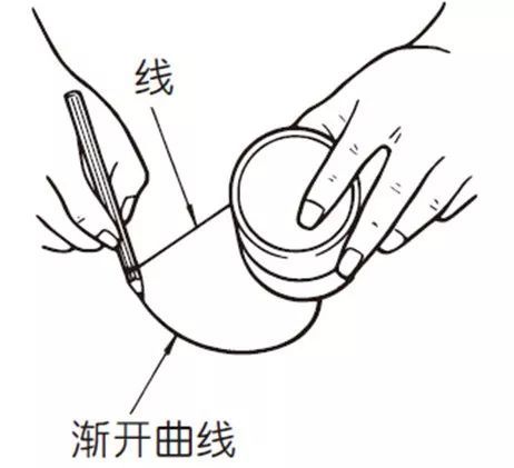 將一端系有鉛筆的線纏在圓筒的外周上,然后在線繃緊的狀態(tài)下將線漸漸放開。此時,鉛筆所畫出的曲線即為漸開曲線。圓筒的外周被稱為基圓。