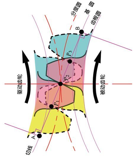 兩個齒輪齒形的嚙合接觸點按P1—P2—P3的順序在嚙合線上移動。請注意驅(qū)動齒輪中黃色的輪齒。這個齒開始嚙合后的一段時間內(nèi),齒輪為兩齒嚙合(P1、P3)。嚙合繼續(xù),當(dāng)嚙合點移動到分度圓上的點P2時,嚙合輪齒只剩下了一個。嚙合繼續(xù)進(jìn)行,嚙合點移動到點P3時,下一個輪齒開始在P1點嚙合,再次形成兩齒嚙合的狀態(tài)。就像這樣,齒輪的兩齒嚙合與單齒嚙合交互重復(fù)傳遞旋轉(zhuǎn)運動。