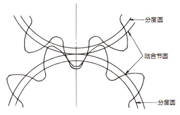 標(biāo)準(zhǔn)齒輪是在各個齒輪的分度圓相切狀態(tài)下嚙合。而經(jīng)過變位的齒輪的嚙合,如圖所示,是在嚙合節(jié)圓上相切嚙合。嚙合節(jié)圓上的壓力角稱為嚙合角。嚙合角與分度圓上的壓力角(分度圓壓力角)不同。嚙合角是設(shè)計變位齒輪時的重要要素。
