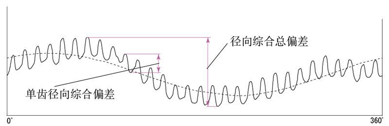 到此為止,我們所敘述的齒形、齒距、齒線精度等,都是評價齒輪單體精度的方法。與此不同的是,還有將齒輪與測量齒輪嚙合后評價齒輪精度的兩齒面嚙合試驗的方法。被測齒輪的左右兩齒面與測量齒輪接觸嚙合,并旋轉(zhuǎn)一整周。記錄中心距離的變化。下圖是齒數(shù)為30的齒輪的試驗結(jié)果。單齒徑向綜合偏差的波浪線共有30個。徑向綜合總偏差值大約為徑向跳動偏差與單齒徑向綜合偏差的和。
