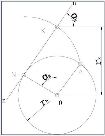 齒輪的壓力角,以漸開(kāi)線齒輪為例。當(dāng)一直線nn沿一圓周作純滾動(dòng)時(shí),此直線上任一點(diǎn)K的軌跡即稱為該圓的漸開(kāi)線,該圓稱為漸開(kāi)線的基圓,而該直線nn則稱為發(fā)生線,曲線AK為漸開(kāi)線。用漸開(kāi)線作為齒廓的的齒輪稱為漸開(kāi)線齒輪。漸開(kāi)線上任一點(diǎn)法向壓力的方向線(即漸開(kāi)線在該點(diǎn)的法線)和該點(diǎn)速度方向之間的銳夾角αk稱為該點(diǎn)的壓力角。