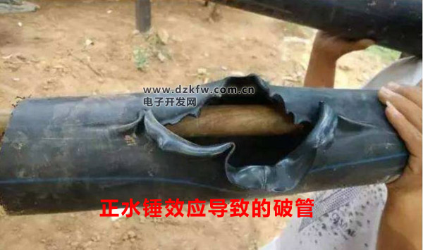 管道閥門如果從打開狀態突然變成關閉狀態,形成的“水錘效應”叫做正水錘,當發生正水錘時,壓力管道中的壓力會突然升高,甚至可以超過管中正常壓力的幾十倍至幾百倍,從而導致管壁產生非常大的應力。而這種壓力隨著水流的反復變化將引起管道和設備的振動,管道的應力交變變化,最終將造成管道、管件和設備的損壞、破裂、泄漏等。