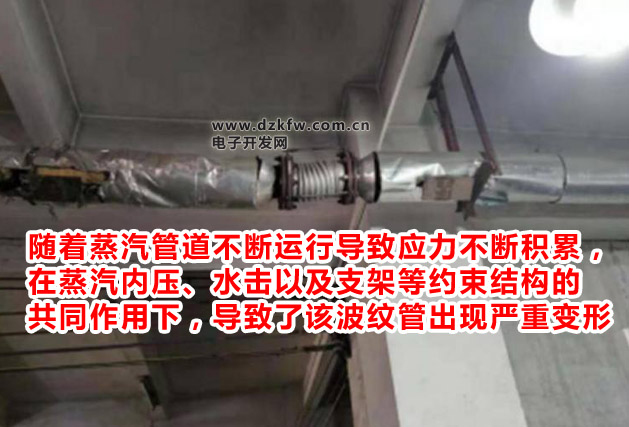 2019年12月,廣州承壓院就曾對廣州市白云區某企業在用的蒸汽管道進行年度檢查時發現,該企業一樓脫水車間內的一個波紋管發生變形失效。經過技術人員分析,由于該蒸汽管道使用時間將近12年了,在日常運行使用當中,不可避免地經歷了不斷停機開機、熱脹冷縮等交變工況,導致管道承受振動、溫差、內壓波動引起的交變應力載荷。