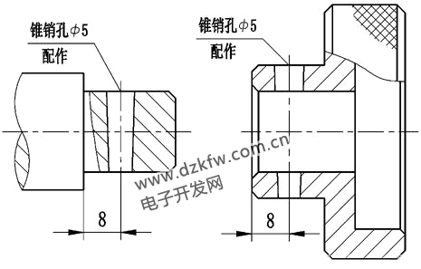 兩零件用銷聯(lián)接,銷孔在裝配時(shí)才加工,所以在零件圖上除注出銷孔的定形和定位尺寸以外,還必須注明"配作"兩字。