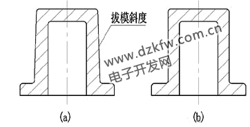 拔模斜度在零件圖上一般不畫出也不標(biāo)注(如圖b所示)。必要時(shí)在技術(shù)要求中統(tǒng)一注寫"拔模斜度1:20"。
