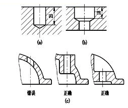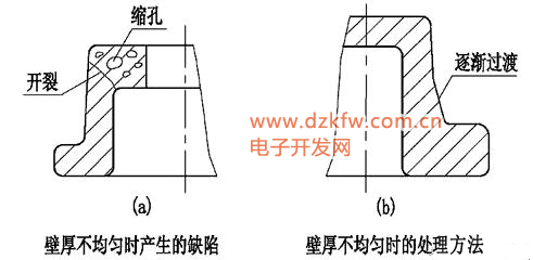 為了避免澆鑄時(shí)零件各部分因冷卻速度不同而產(chǎn)生縮孔或裂紋等缺陷(圖a),鑄件壁厚應(yīng)均勻。不要突然變化,厚薄不同的部件應(yīng)逐漸過渡(圖b)。