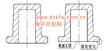 毛坯經(jīng)過機(jī)械加工后,粗皮被削去,鑄造圓角消失并產(chǎn)生了加工形成的尖角。