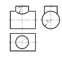 2. 兩圓柱相交時(shí),過渡線可采用簡化畫法,用弧線畫出過渡線,弧線的半徑等于兩圓柱中較大的圓面半徑,如左圖所示。