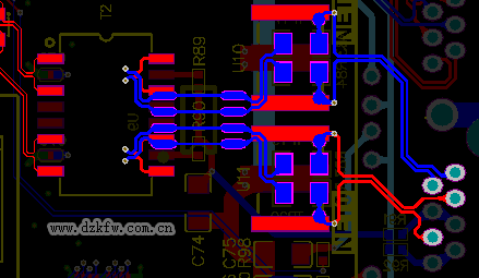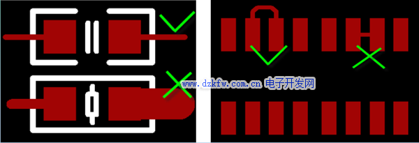 (10)小的分立器件走線須對稱,間距比較密的SMT焊盤引線應(yīng)從焊盤外部連接,不允許在焊盤中間直接連接。