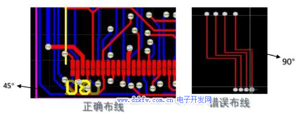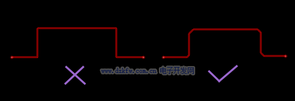 (2)走線方式:必須按照45°的拐角方式,不要用90°的拐角。如下圖: