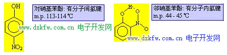 H2O 和 HF 的分子間氫鍵很強, 以致于分子發生締合, 以(H2O)2、 (H2O)3、(HF)2、(HF)3 形式存在, 而 (H2O)2 排列最緊密, 4℃時, (H2O)2 比例最大, 故 4℃ 時水的密度最大. 可以形成分子內氫鍵時, 勢必削弱分子間氫鍵的形成. 故有分子內氫鍵的化合物的沸點、熔點不是很高.典型的例子是對硝基苯酚和鄰硝基苯酚: