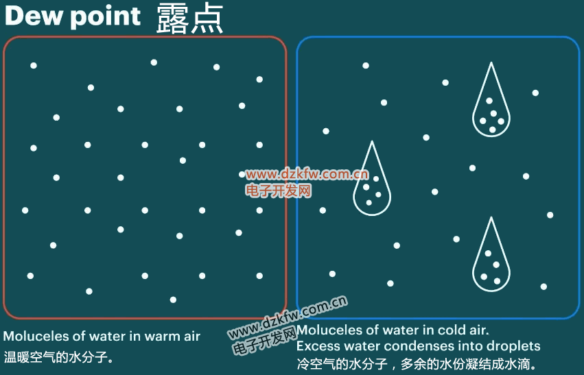 圖1因此,所謂的露點(diǎn)是空氣相對(duì)濕度達(dá)到 100% 時(shí)水蒸氣開(kāi)始“析出”即凝結(jié)的溫度。換句話說(shuō),露點(diǎn)是空氣需要冷卻到一定溫度才能釋放出水凝結(jié)物(出現(xiàn)露水)。