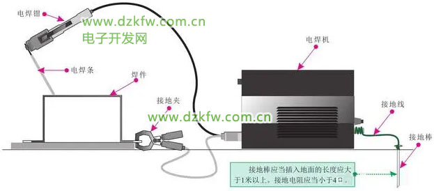 將電焊機(jī)的外殼進(jìn)行保護(hù)性接地或接零,如圖5-56所示。接地裝置可以使用銅管或無(wú)縫鋼管,將其埋入地下深度應(yīng)當(dāng)大于1m,接地電阻應(yīng)當(dāng)小于4Ω;再將一根導(dǎo)線的一端連接在接地裝置上,另一端連接在電焊機(jī)的外殼接地端上。
