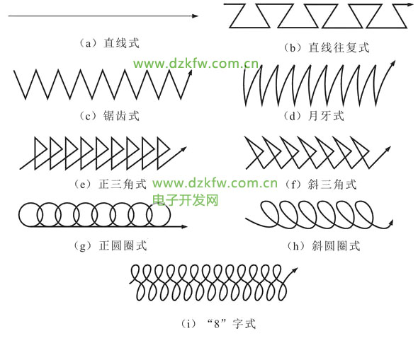 在對(duì)較厚的焊件進(jìn)行焊接時(shí),為了獲得較寬的焊縫,焊條應(yīng)沿焊縫橫向做規(guī)律擺動(dòng)。根據(jù)擺動(dòng)規(guī)律的不同,通常有以下運(yùn)動(dòng)方式,如圖5-64所示。