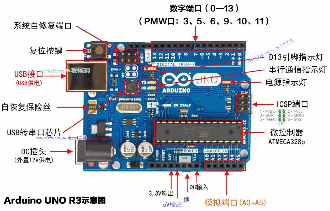 下面是一張Ardunio Uno R3的引腳圖,包含14個(gè)數(shù)字引腳、6個(gè)模擬輸入、電源插孔、USB連接和ICSP插頭等。