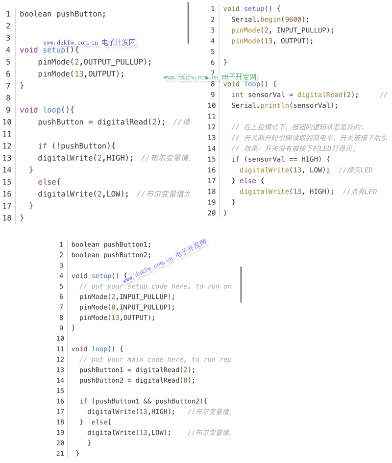 ●第一段代碼定義了一個布爾型變量pushButton,將2號引腳的電平狀態(tài)賦給pushButton,并直接根據(jù)pushButton的真假賦予1/0進(jìn)入條件判定,同時在判定時加入了邏輯運算符!,使得判定的值相反。所以該代碼的運算結(jié)果為按下按鈕時LED燈亮,松開按鈕時LED燈不亮。