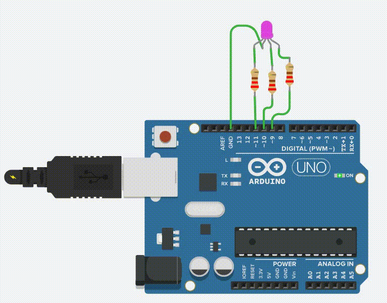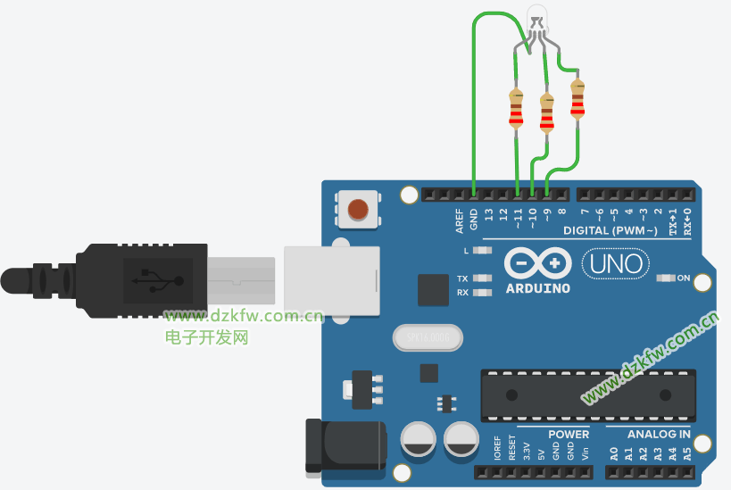 | Arduino引腳 | RGB LED(共陰極) |