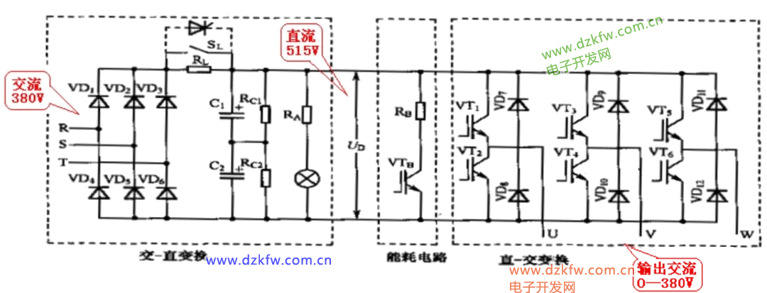 如圖1所示為變頻器的主電路圖中可以看出,其主電路由交-直-交方式組成,外部輸入220V或380V/50Hz的工頻電源經(jīng)三相整流橋整流成直流電壓,經(jīng)大容量的電解電容濾波及IGBT逆變?yōu)轭l率可變的交流電壓。在三相整流電路中,輸入電流的波形為不規(guī)則的矩形波,波形按傅立葉級(jí)數(shù)分解為基波和各次諧波,諧波次數(shù)通常為6n±1次高次諧波,其中的高次諧波將干擾輸入供電系統(tǒng)。