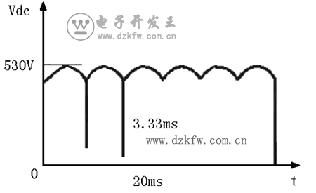 當(dāng)變頻器不發(fā)生缺相的正常情況下工作時(shí),Udc上的電壓如圖2所示,一個(gè)工頻周期內(nèi)將有6個(gè)波頭,此時(shí)直流電壓Udc將不會(huì)低于470V,實(shí)際上對(duì)于一個(gè)7.5kW的變頻器而言,其C的值大小一般為900uf,當(dāng)滿載運(yùn)行時(shí),可以計(jì)算出周期性的電壓降落大致為40V,紋波系數(shù)不會(huì)超過(guò)7.5%。而當(dāng)輸入缺相發(fā)生時(shí),一個(gè)工頻周期中只有2個(gè)電壓波頭,且整流電壓最低值為零。此時(shí)在上述條件下,可以估算出電壓降落大致為150V,紋波系數(shù)要達(dá)到30%左右。