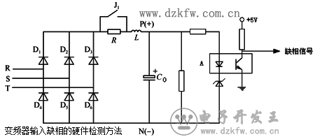 檢測(cè)變頻器輸入缺相,最簡(jiǎn)單的一種方法就是使用硬件檢測(cè),如圖3所示是其中的一種方法。該電路中C0上的電壓高低將反映R、S、T三相輸入有無(wú)缺相,當(dāng)發(fā)生缺相時(shí),C0上的電壓降低,光藕器件將不導(dǎo)通,A點(diǎn)的信號(hào)為高電平,對(duì)應(yīng)缺相的發(fā)生。