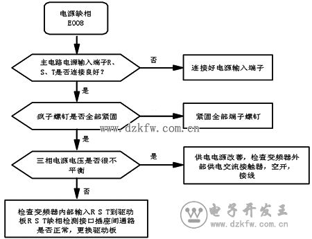 對(duì)于缺相故障,艾默生變頻器EV/TD系列故障代碼顯示E008(輸入側(cè)缺相)、E009(輸出側(cè)缺相)。故障定位如圖4和圖5所示。