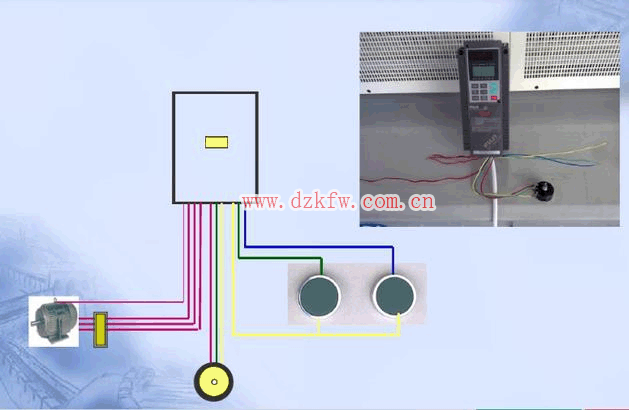 端子CM(黃線)、REV(藍(lán)線))、FWD(綠線)接按鈕開關(guān),其中黃線CM為公共端子,具體連線方法如下圖所示:
