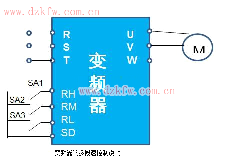 RH、RM,RL3個端子組合可以進行7擋轉(zhuǎn)速控制,各擋的具體運行頻率需要用相應(yīng)參數(shù)設(shè)置。