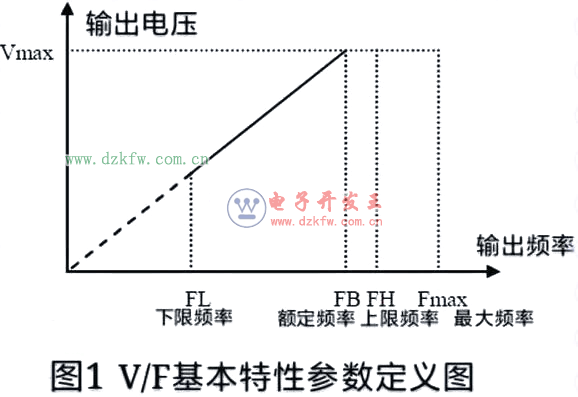 圖1為V/F基本特性參數定義它是現在應用得最多的一種形式的變頻器,當變頻器的輸出頻率從0Hz上升到50Hz時,輸出電壓從0V成正比地上升到380V。