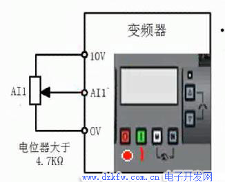1、面板啟停,AI1模擬量輸入端給定頻率。
