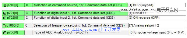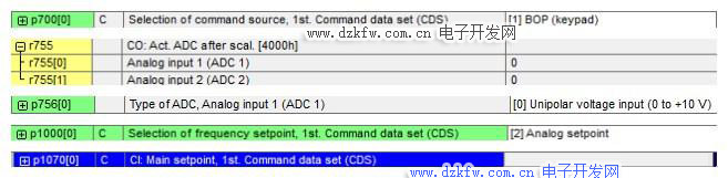 當(dāng)然也可以通過將P1000(0)=2;模擬量輸入;P1070(0)=755.1;AI2頻率給定。