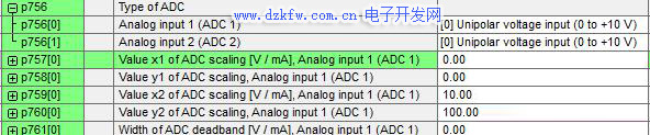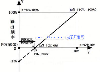 參見上圖;若設(shè)置P0761(0)=2時(shí),即設(shè)置死區(qū)寬度為2V,那么AI1端輸入0~2V之間,輸出頻率都是0Hz。