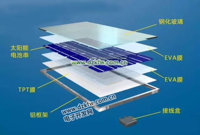 在電池串的上面采用鋼化玻璃封裝,有很高的強度與很好的透光性,可有效地保護電池片;電池片的下面采用有良好絕緣性能、能抗紫外線抗環境侵蝕的熱塑聚氯乙 烯復合膜(TPT)做背面:三者之間采用熱融膠粘膜(EVA)進行粘接,EVA透光率高,并有柔韌、耐沖擊、耐腐蝕,在熱壓下熔融固化后有很好的粘合性。 封裝的層次見圖8.