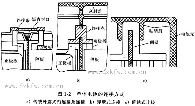 蓄電池一般都由3個或6個單體電池串聯而成,額定電壓分別為6V或12V。單體電池的串接方式一般有傳統外露式、穿壁式和跨越式三種方式,如圖1—2所示。