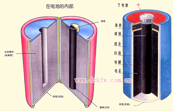 干電池的外殼是一個用鋅做成的筒,里面裝著化學藥品,鋅筒中央立著一根碳棒,碳棒頂端固定著一個銅帽。