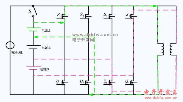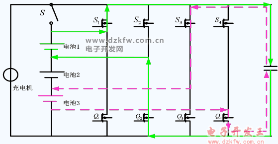 控制原理如下:設電池組內 B4 電壓最高,B2 電壓最低,控制繼電器 S5、S3、Q4、Q2 閉合,此時兩節單體電池并聯,兩單體電池自動均衡,電壓趨于一致。該拓撲的缺點是充電過程中不能進行均衡,只能靜置去極化時候進行并聯均衡。