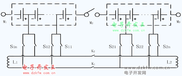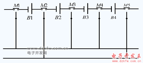 如下圖所示的并聯拓撲結構,每節單體電池都有一個單刀雙擲的開關繼電器,所以 n 節串聯電池組內需要 n 1 個繼電器。
