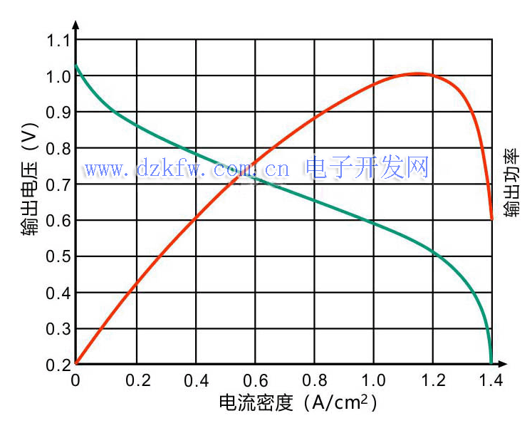 圖3是單個電池輸出性能曲線,圖中綠色曲線是電池輸出電壓隨輸出電流密度變化的曲線,電流密度是電池工作截面上每平方厘米通過的電流值。可看出電池開路電壓約1V,隨輸出電流增大,電壓明顯下降。在電流密度為1A至1.2A輸出功率最大,但輸出電壓僅0.5V至0.6V。